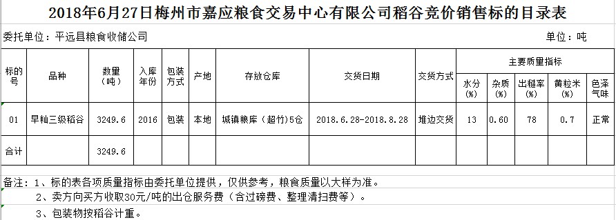 受客戶委托,梅州市嘉應糧食交易中心有限公司定于2018年6月27日(星期三)舉辦糧食競價交易會,平遠縣糧食收儲公司擬銷售早秈稻3249.6噸。