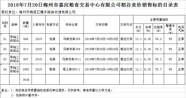 受客戶委托,梅州市嘉應糧食交易中心有限公司定于2018年7月20日(星期五)舉辦糧食競價交易會,梅州市梅縣區(qū)穗豐糧食收儲有限公司擬銷售早秈稻3838噸。