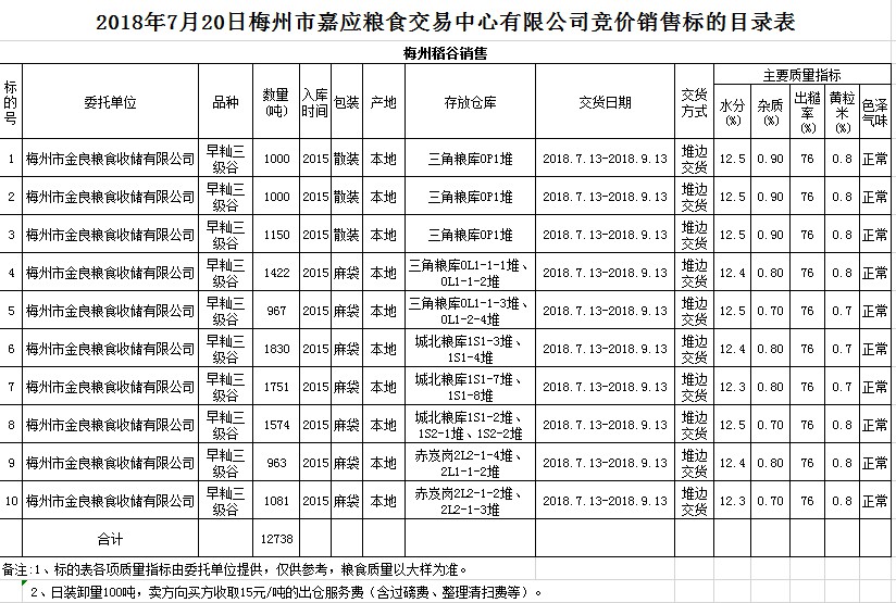 受客戶委托,梅州市嘉應(yīng)糧食交易中心有限公司定于2018年7月20日(星期五)舉辦糧食競價(jià)交易會,梅州市金良糧食收儲有限公司擬銷售早秈稻12738噸。