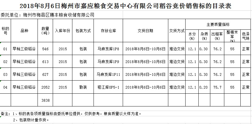 受客戶委托,梅州市嘉應(yīng)糧食交易中心有限公司定于2018年8月6日(星期一)舉辦糧食競(jìng)價(jià)交易會(huì),梅州市梅縣區(qū)穗豐糧食收儲(chǔ)有限公司擬銷售早秈稻3838噸。